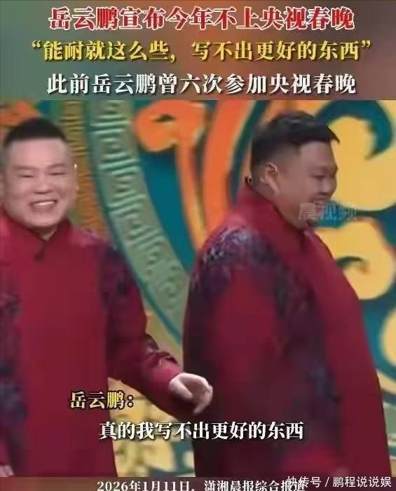 笔者观点体面从来不是靠“躲”出来的,而是靠“硬通货”挣回来的。如果不能从根本上重构自己的业务逻辑,找回那个曾经对舞台充满敬畏的初心,那么今天的告别春晚,可能只是未来一连串市场抛弃行为的开始。毕竟,在这个残酷的角斗场里,没有人能永远靠“吃老本”活下去。【牡丹融媒】岳云鹏称今年将缺席央视春晚:能耐就这么些,写不出更好的东西;去年被现场观众“贴脸开大”建议别上春晚【青橙融媒】岳云鹏确认缺席2026央视春晚:以自己现在的能力,写不出更好的东西【极目新闻]岳云鹏夫妇公司欠税14万被公告【生活帮】岳云鹏在大连专场中回应“今年不上春晚”
